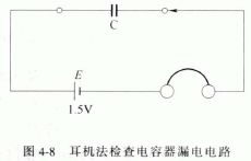 這種方法只適用于對電容量較大電容器的絕緣電阻的判斷,可以用一副耳機(jī)和一節(jié)1.5V干電池組成簡易測試電路,如圖4-8 所示。測試時,當(dāng)耳機(jī)與電容器斷續(xù)相碰時,電池向電容器充電,耳機(jī)會發(fā)出"喀喀"聲響。若多碰幾次,電容器被充滿電就昕不到"喀喀"聲了,說明電容器漏電流很小,絕緣電阻正常。若每相碰一次,耳機(jī)都發(fā)出很響的"喀喀"聲,說明電容器漏電大,絕緣電阻不正常。如果第一次相碰時就無聲響,并一直無聲響,說明電容器己斷路,不能使用。