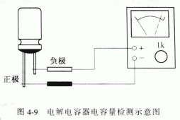 下面介紹一下用萬用表檢測電解電容器電容量的方法。首先將萬用表的歐姆擋置于R x 1k的位置,政表筆短接調(diào)零。將萬用表的黑表筆接電解電容器的正極,紅表筆接電解電容器的負(fù)極,如圖4-9 所示。由于原先電容器是未充電的,當(dāng)兩表筆剛接通電容器時,萬用表內(nèi)的電池通過表筆給電容器充電,由于電流流過電路,使萬用表的表針發(fā)生偏轉(zhuǎn)。電容正極量越大,表針的偏轉(zhuǎn)角度越大,如果電容量較小,檢測時表針的偏轉(zhuǎn)角度就較小??筛鶕?jù)這一原理和實(shí)際檢測的經(jīng)驗(yàn)給出不同電容量所對應(yīng)的表針偏轉(zhuǎn)應(yīng)到達(dá)的位置,判斷所測電容器電容量的大小。表針偏轉(zhuǎn)位置與電容量的關(guān)系如表4-13 所示,供檢測時參考。