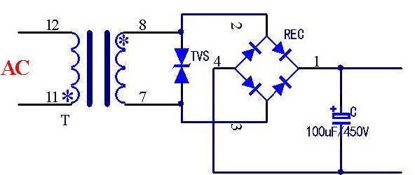若應(yīng)用在交流電路,一般是雙向極性,因?yàn)閬碜詢蓚€方向的浪涌電壓沖擊。如下圖是雙向TVS在交流電路中的應(yīng)用例子,這里TVS二極管的作用是有效地抑制電網(wǎng)帶來的沖擊脈沖,出現(xiàn)過壓時(shí)候,VRMW上升到擊穿電壓而被擊穿,這時(shí)候出現(xiàn)擊穿電流,一旦達(dá)到峰值IPP,兩端的電壓就會被箝位到VC以下。這樣就保護(hù)了后級電路,包括保護(hù)整流橋、電容以及后面的元器件。